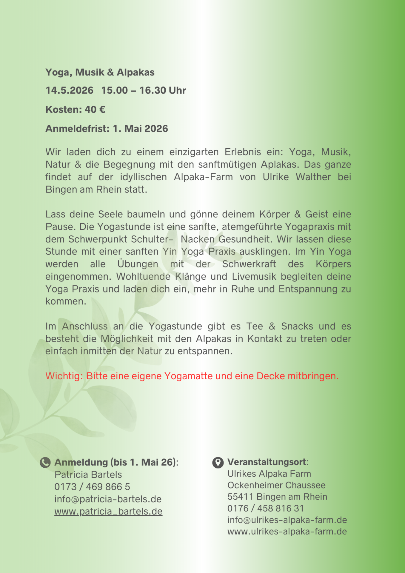 Sie sind gestresst und suchen Entspannung? Dann sind Sie auf Ulrikes Alpaka Farm im schönen Bingen am Rhein (Rheinhessen) genau richtig. Hier können Sie die Seele baumeln lassen und sich eine Pause vom Alltag gönnen.